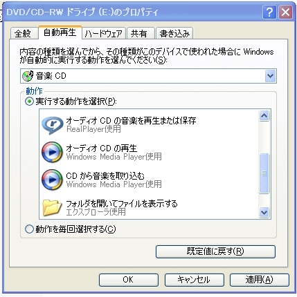 Eドライブのプロパティを見てみたら。。。↑ こんなふうに、全部なっていましたが これって・・・自動再生されない!!って、事なのかしら(・・? 音楽ファイル〜HD DVD ムービーの全てを何で再生するかを設定した方がいいのかな(・・? その場合・・・どのプログラムを使用したらいいのかしら(・・? |